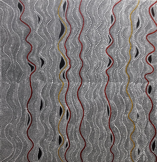 Alice is an artist from Yuendumu and is known for her exceptionally fine dot work and stunning depictions of Mina Mina Jukurrpa (Mina Mina Dreaming). She has painted for Warlukurlangu Artists since 1998 and is married to Francis Kelly Jupurrula, who is also a respected artist from a long family line of artists who promote their culture through their artwork. Bush vines as they relate to women’s tribal ceremonies are an important part of her dreaming and her art.
