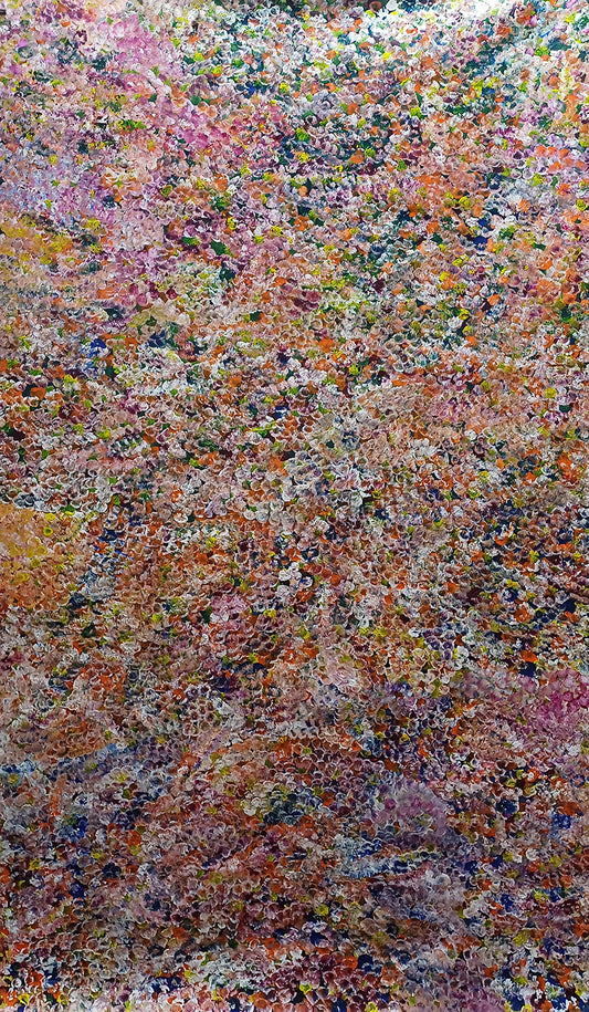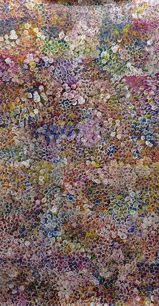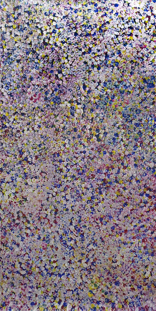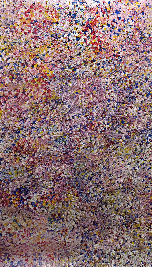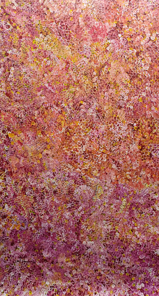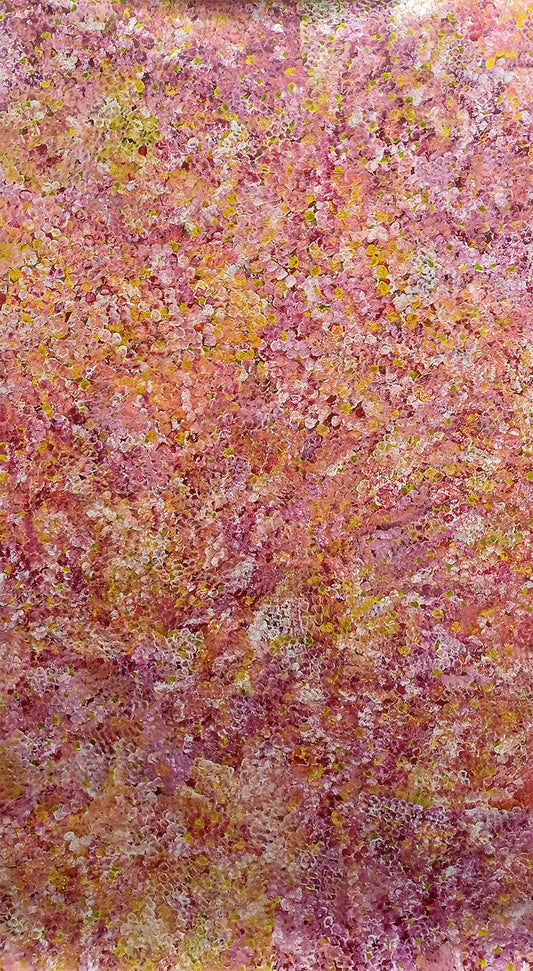 Bessie’s paintings depict the Bush Plum, and the effect of its growth patterns, on her country. She illustrates the topography in varying seasonal colours, building up layer upon layer of colour creating a multi-dimensional effect. The Bush Plum is a significant Dreaming for the women of Utopia. The Aboriginal women pay homage to the spirit of Bush Plum in their Awelye ceremonies to ensure perpetual germination.