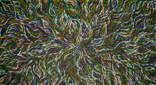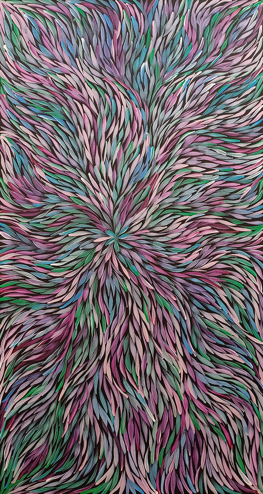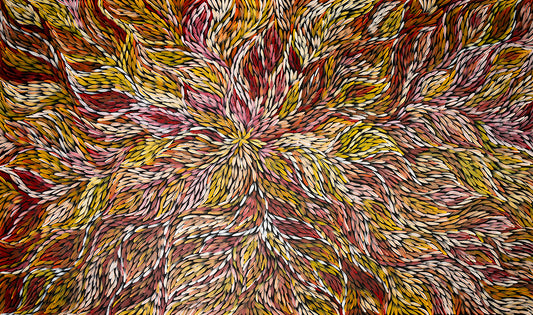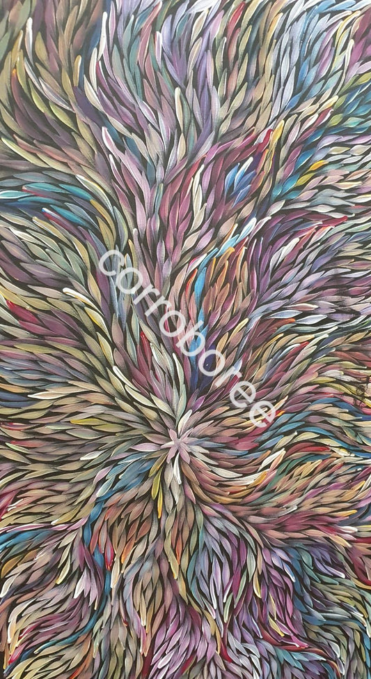 Bethany is the daughter-in-law of the very renowned artist Jeannie Petyarre (deceased), she learned how to paint from the very best, she creates stunning art; she has developed into a very talented artist who paints several dreams with Bush Medicine Leaves & Bush Yam being two of the more prominent dreaming. Bethany is married to Jeannie’s son, Dempsey Pula, who is also an artist.