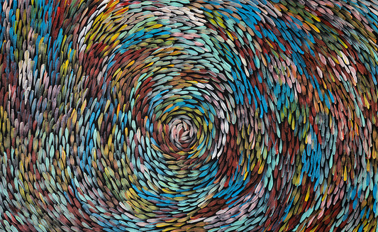 Cindy Morton Pwerle is from the Utopia region of Central Australia. Utopia is an old outstation located 270km North East of Alice Springs. Cindy’s mother is well-known artist Gracie Morton Pwerle and is part of a family of well-established artists. Her family includes Minnie Pwerle, Gloria and Kathleen Petyarre, and Ada Bird Petyarre.