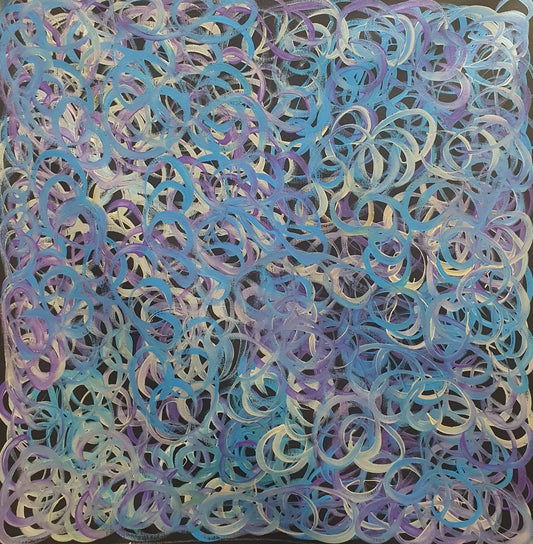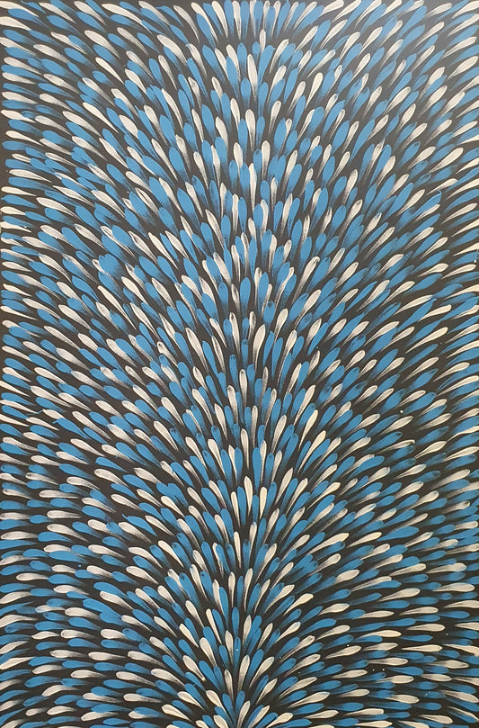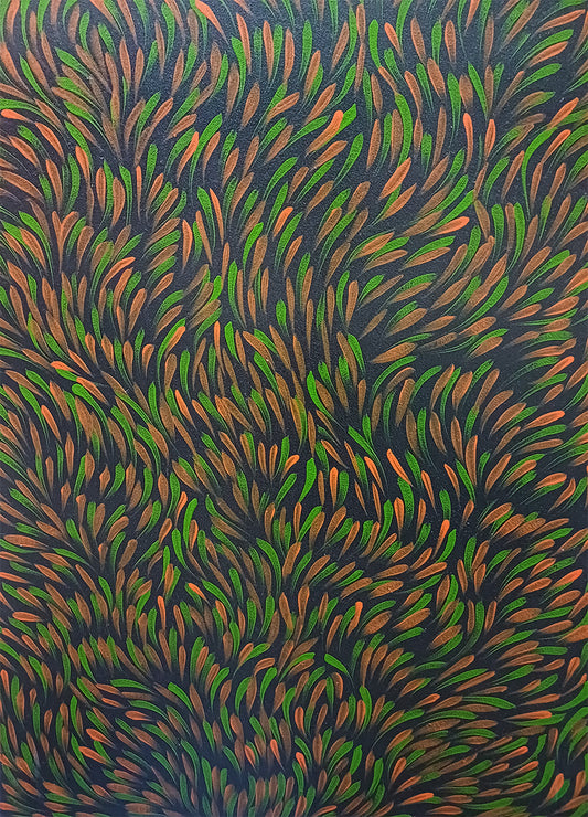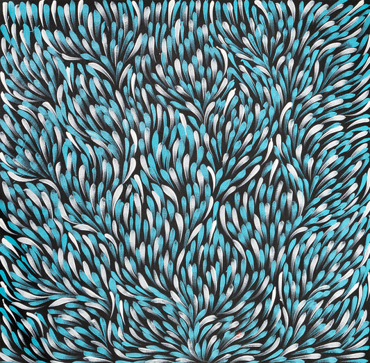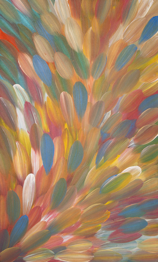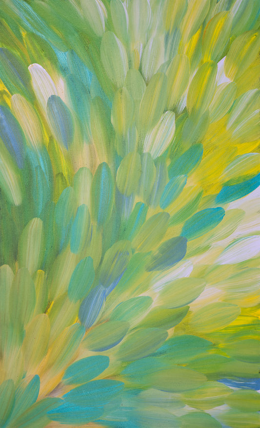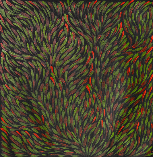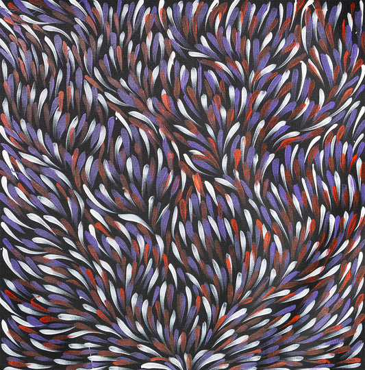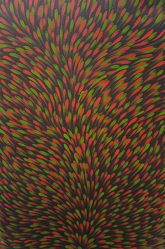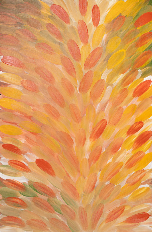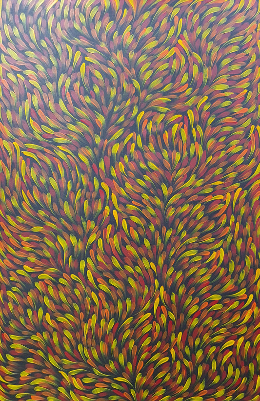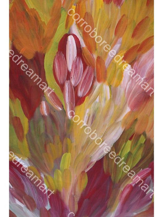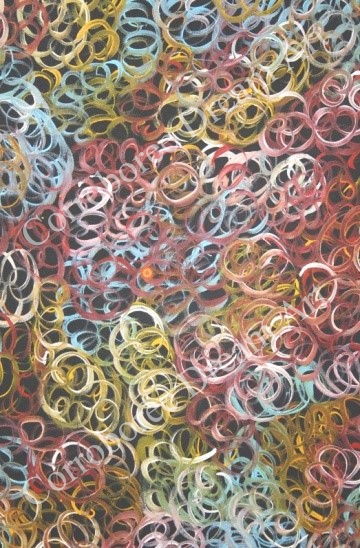 The batik program was a major success, with Gloria being one of the leading artists in this format. Her work gained rapid recognition and was seen by Rodney Gooch from CAAMA. He approached the Utopia artists with a plan called ‘A Summer Project’. The idea was simple, supply the women and men with canvas and acrylics and have them use their techniques on Batik in the new format. The project was a major success, with Gloria and many other artists moving full-time into acrylic on canvas. Gloria paints the traditional women business subjects, which are predominant in Utopia.