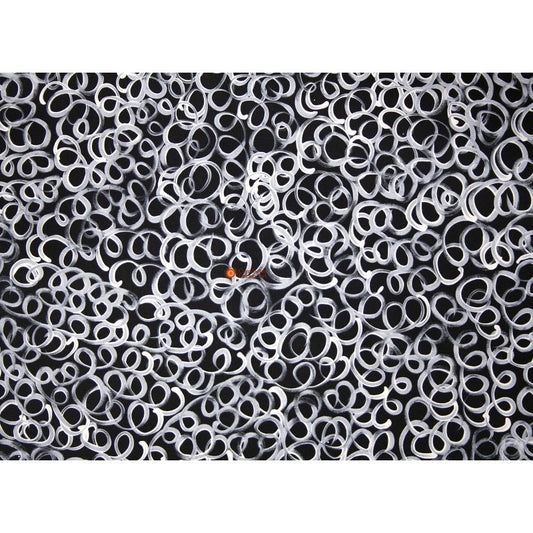 Gloria stands out here, with her work she uses close tonal values of different colors, creating a dynamic optical intensity. Her work features powerful structural linear patterns derived from body painting, outlined with single dots. At other times the structural pattern becomes submerged in a sea of dots, the tonal relationships causing the structural pattern to dissolve into the base design of her painting.