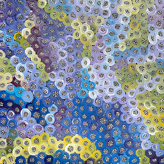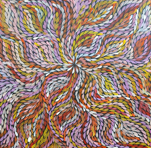 Janet is married to Ronnie Bird, son of artists, Paddy and Eileen Bird. Together, they have four children: Rochelle, Renedy, Katrina and Troyton. Janet would have been taught to paint by her family and has been painting since 1997. Her painting style is even, fine dot work, creating linear patterns and the major subject she paints is Awelye (ceremonial body paint design). Janet is also able to paint other stories including Mountain Devil Lizard and Emy.
