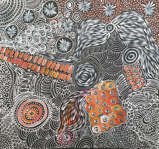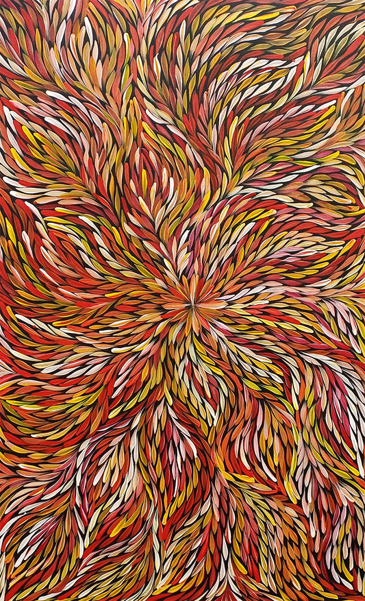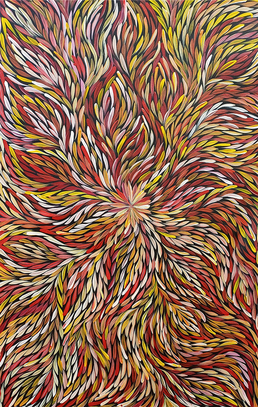 She is a talented artist, taught by her extended family of well known artists. Janet is the custodian of a number of dreamings, predominantly Bush Medicine and ceremonial body paint and Mountain Devil Lizard. Her works depict Atnwelarre and Kame, Awelye (Women’s Ceremonial Body Paint), Jerma Seed, Bush Yam or Yam Leaf.