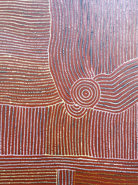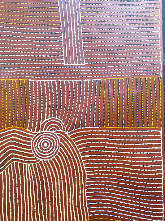 A recurring theme in Rosemary's art is the Tjilkamata Tjukurrpa (Echidna Dreaming) story passed down to her by her grandmother, alongside Minyma Tjukurrpa (Women's Dreaming). Using the traditional dot and line work of the Western Desert style, Rosemary depicts aspects of women’s ceremony, including both iconography of women’s body paint designs, and the topographic view of the ceremony taking place within the landscape. Horizontal and vertical stripes represent the lines of women’s body paint designs, and the rounded forms representing the echidna or ‘porcupine’.